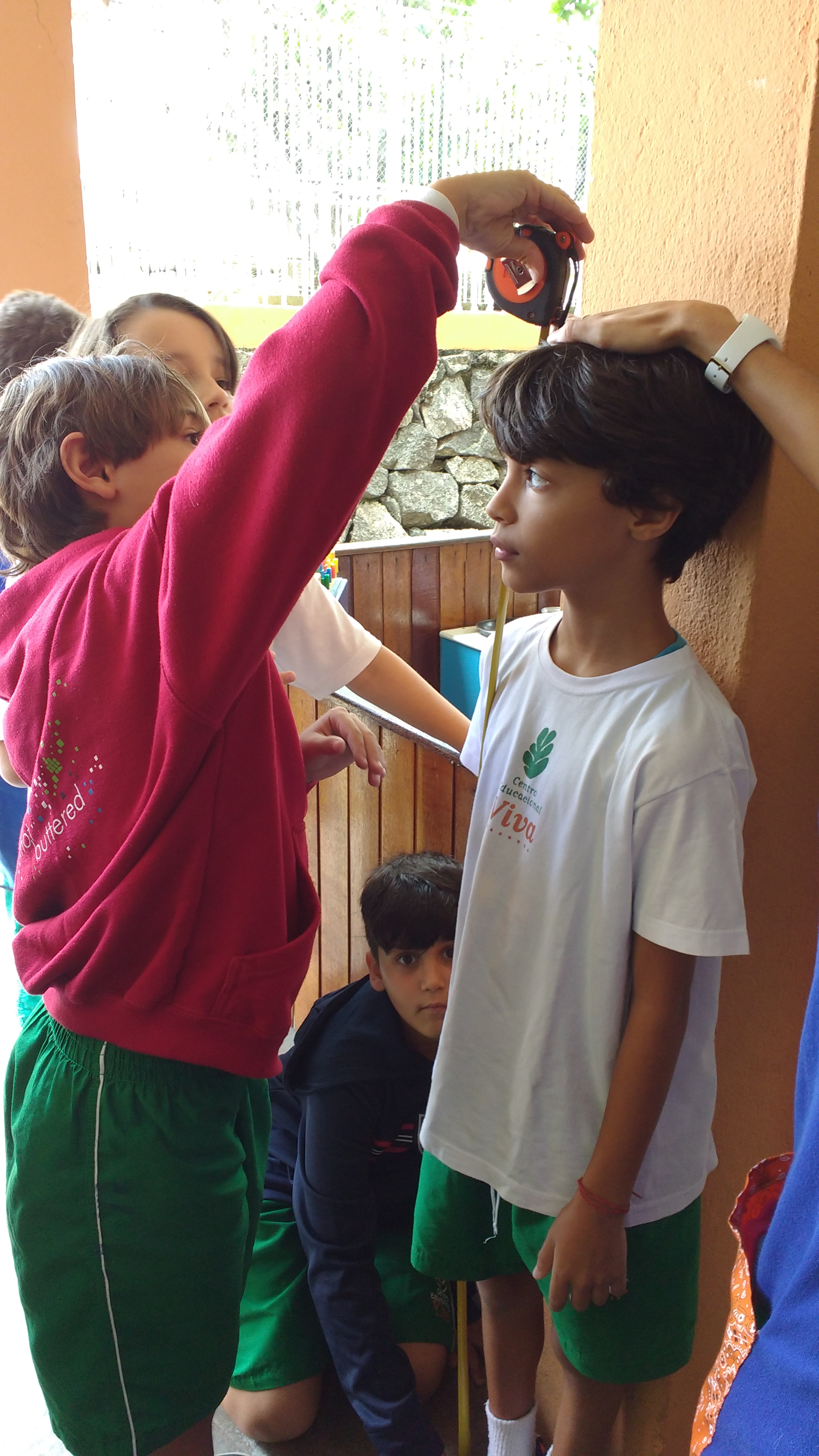 A turma do 4º ano vem trabalhando pesos e medidas nas aulas de inglês. As crianças descobriram algumas formas de medir e pesar coisas e aprenderam novos vocábulos como scales (balança), mass (massa), length (largura), height (altura), tape measure (trena) entre outros. Utilizaram a régua para medir coisas pequenas na sala e entenderam a diferença entre metres (metros), centimetres (centímetros) e milimetres (milímetros). Dentro desse trabalho, o grupo usou a trena para medir a altura dos alunos, da teacher Bárbara e de outros profissionais da escola.
