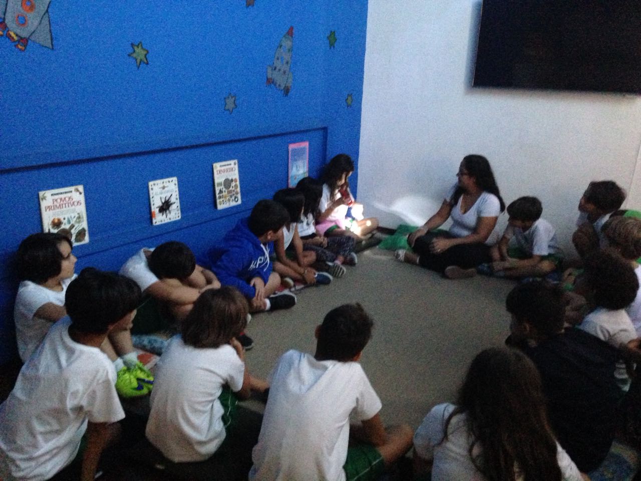 No mês de março realizamos uma atividade coletiva na biblioteca Monteiro Lobato, que uniu os alunos do 3º e 4° ano para o desenvolvimento da autonomia, criatividade, interação e trocas de saberes. Deixamos a sala um pouco na penumbra, criando um ar de mistério e curiosidade, e os alunos sentaram em círculo, surpresos e ansiosos. Foi escrito em tiras de papéis alguns elementos como: sol, planeta, estrelas, Terra, etc, que foram colocadas dentro de uma caixa. Cada aluno, com o foco de luz da lanterna, leu a palavra em voz alta e compartilhou seus conhecimentos sobre o elemento, trocando ideias do que cada um já sabia a respeito das palavras. No final da troca de saberes, perguntamos se sabiam qual seria o tema do nosso projeto escolar. E eles, entusiasmados, disseram que tinha a ver com o universo, ou seja, "A origem do universo", e o objetivo foi alcançado.