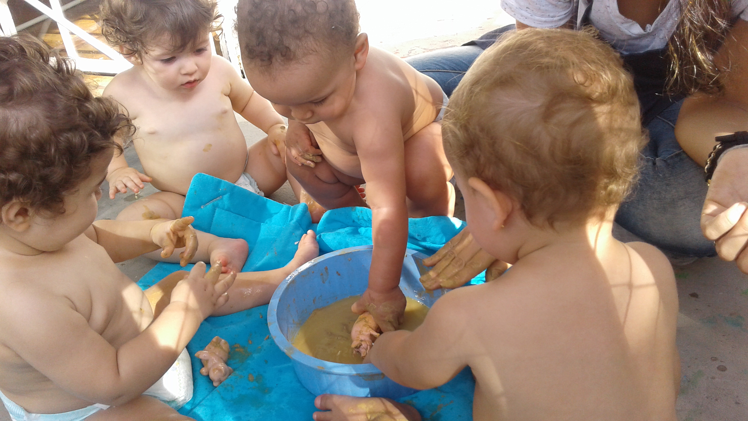 Os bebês manusearam caixas vazias de leite e bolinhas de algodão. Após intensas investigações foi colocada uma pequena piscina com água e com bolinhas de algodão proporcionando mais exploração e aprendizado, com momentos de interação e estímulo da linguagem e desenvolvimento sensorial.