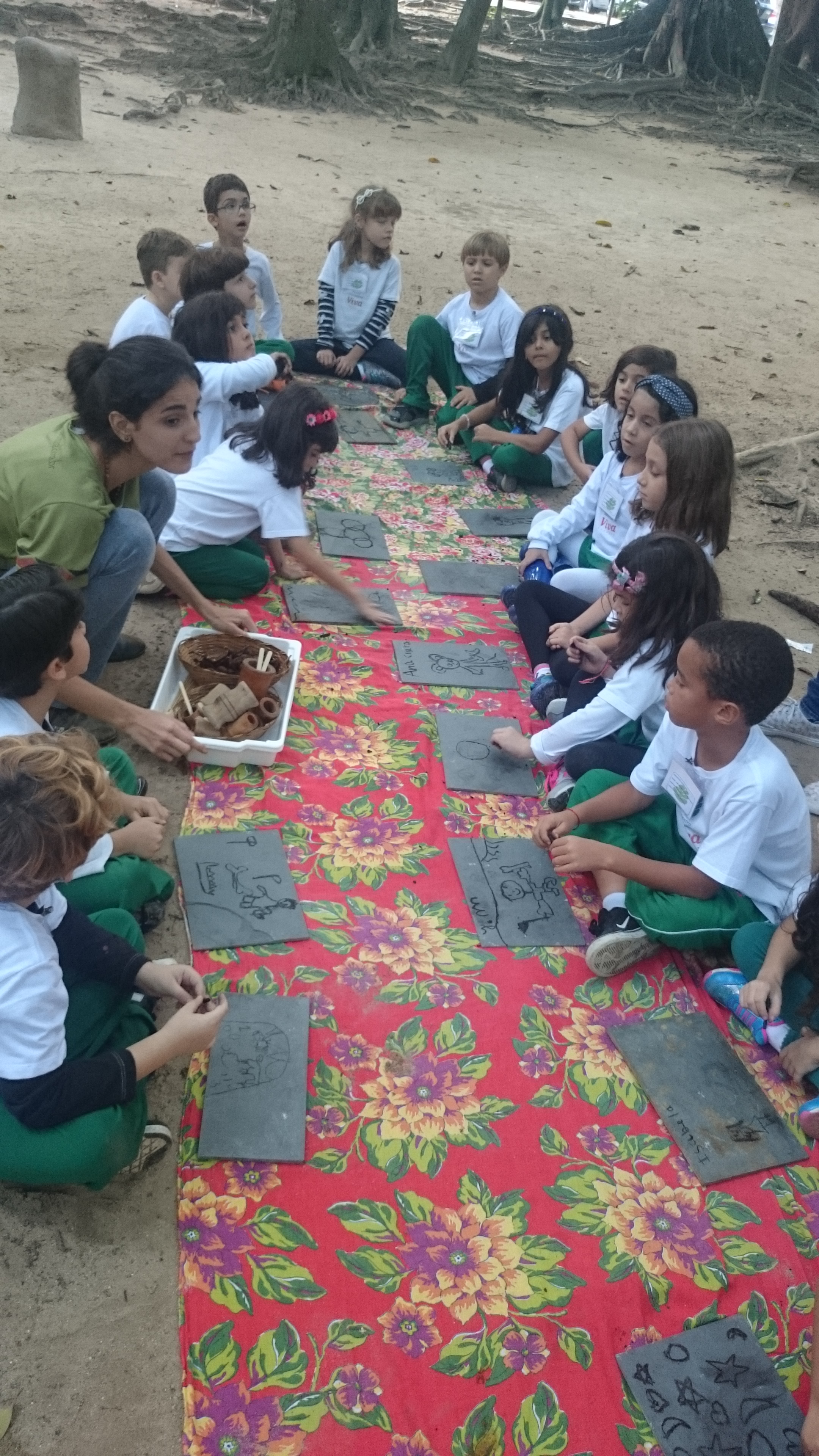 No final, as crianças fizeram suas próprias pinturas rupestres utilizando carvão e tinta natural feita com urucum em uma placa de ardósia.