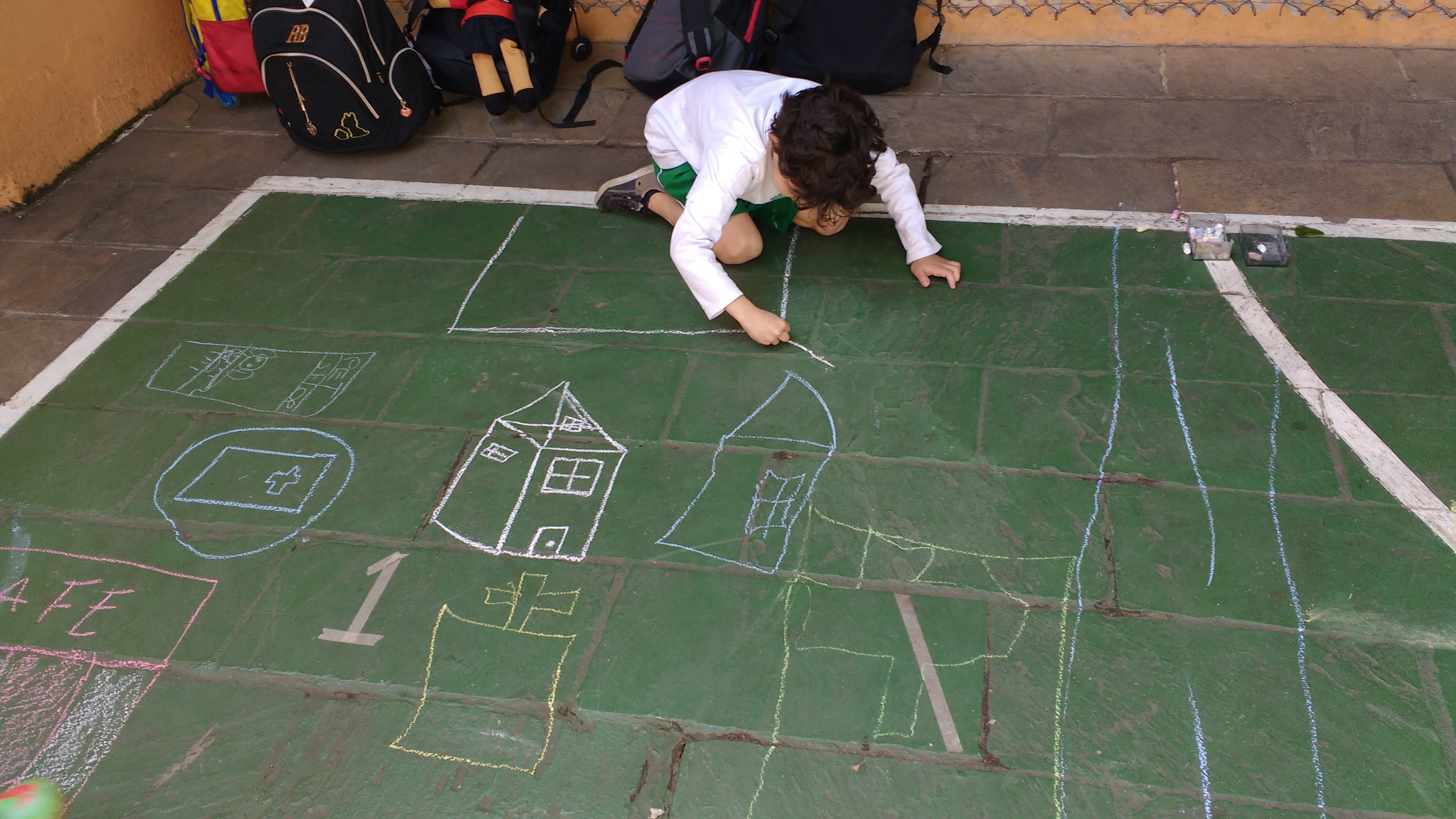 As crianças do 2º ano se divertiram com uma atividade diferente: desenhar uma cidade na quadra, usando giz. A proposta é parte do planejamento da unidade 8 do livro "My Town" (Minha Cidade). O grupo tem ampliado bastante o vocabulário, aprendendo novas palavras como church, school, bank, pet shop, toy shop, supermarket etc.