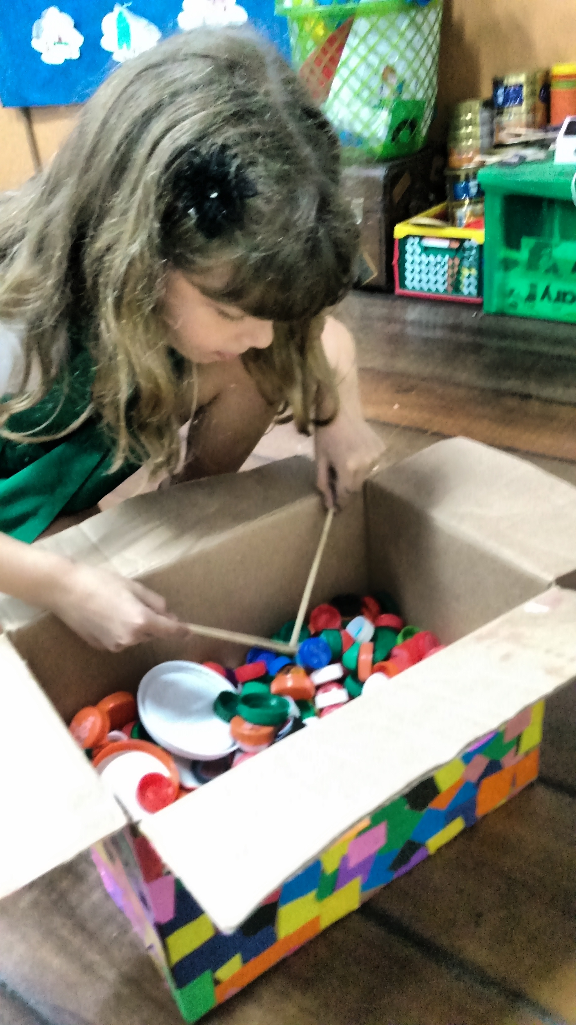 Depois de manusearem os hashis foi a hora da brincadeira! Organizamos uma corrida dos hashis. A turma foi dividida em dois grupos e cada grupo tinha que pegar na canastra a quantidade de tampinhas solicitada utilizando apenas os palitinhos. Uma criança por vez pegava a tampinha e colocava dentro da lata até que todos participassem. Ganhava a prova o grupo que primeiro cumprisse a tarefa. Foi pura diversão!