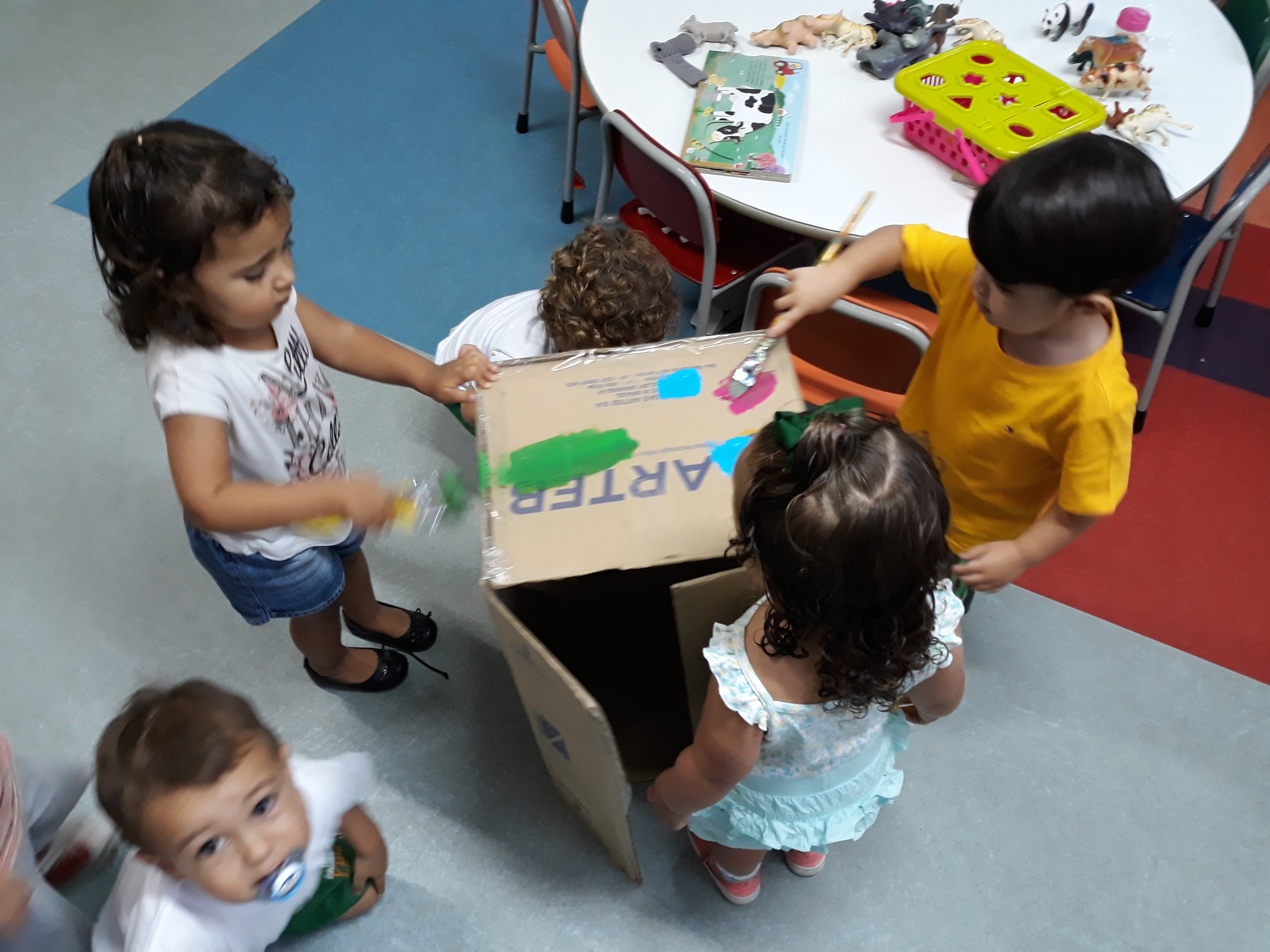 Com o projeto "Chapeuzinho Vermelho" a todo vapor, o Grupo IA construiu a cesta da chapeuzinho com sucata. Passeou pela escola para colher folhas e gravetos e aproveitou para conhecer novas texturas, como a palha.