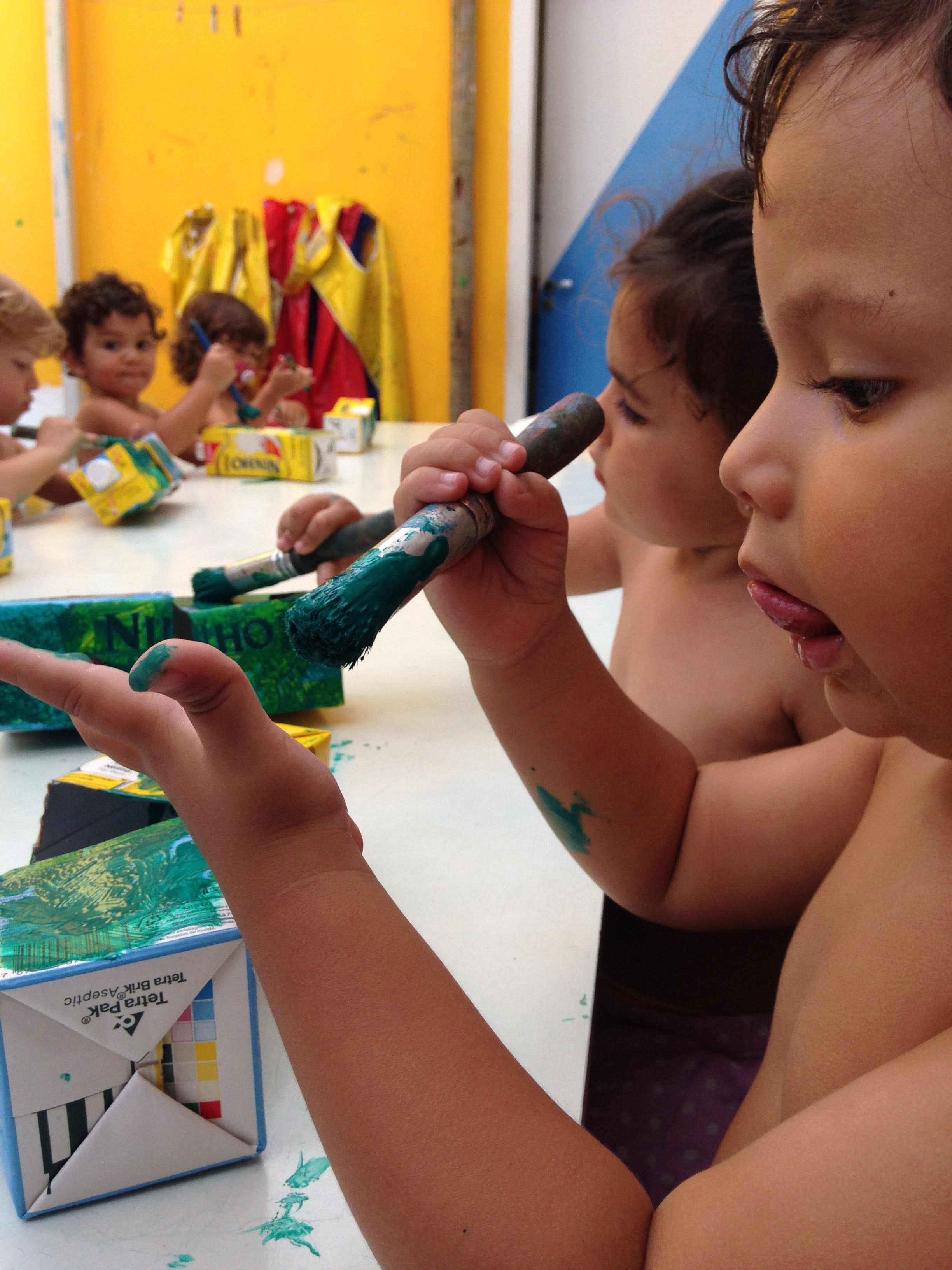 Em nossas brincadeiras, tivemos pinturas com tinta colorida e nanquim, muitas bolinhas de sabão voando pelo pátio e desenhos com giz no chão. Confeccionamos fantoches de saco de papel e móbiles para a sala.