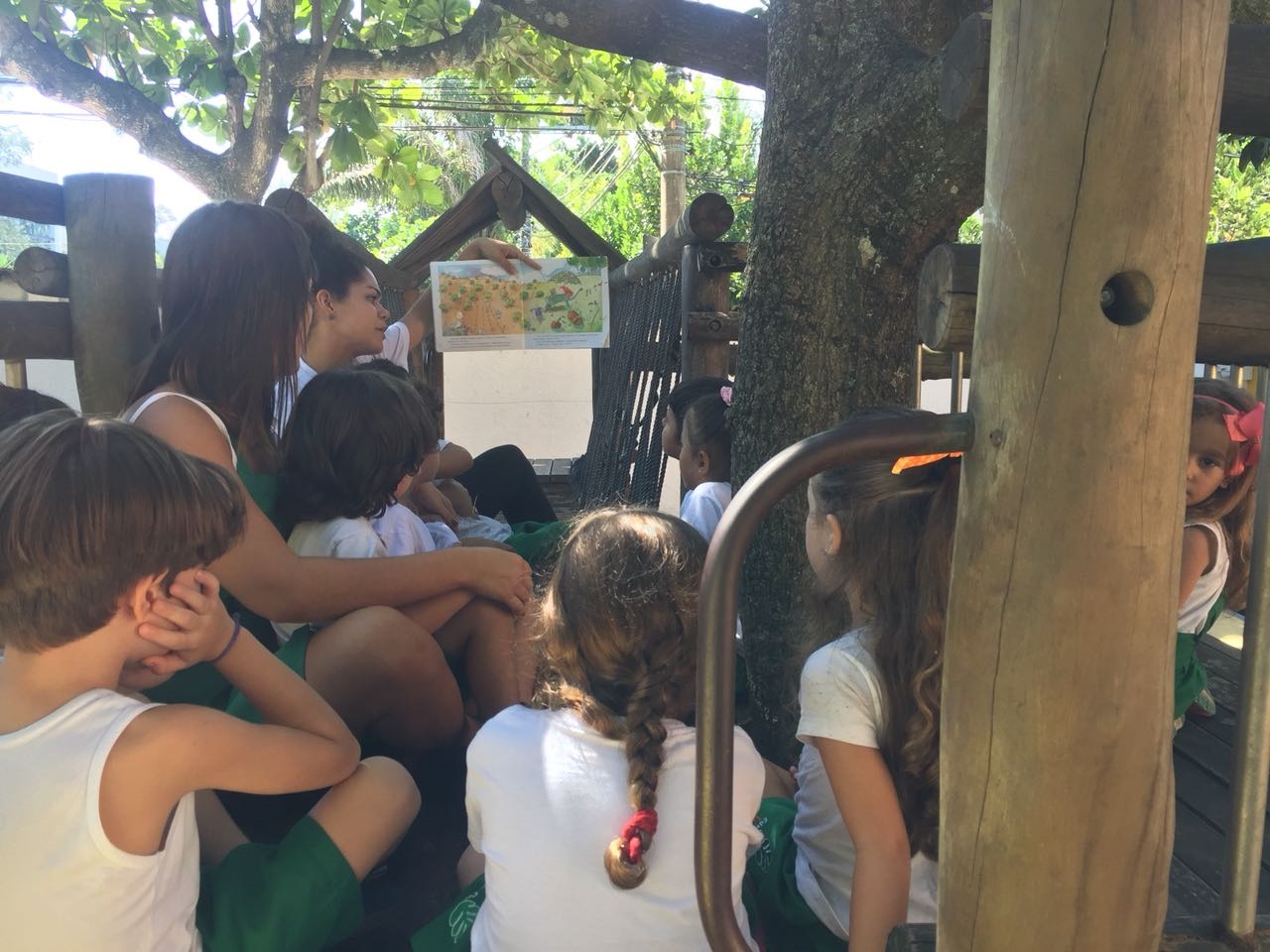 Demos início ao projeto "Apreciação da natureza" ouvindo a história "Conte uma história Estela", um livro que envolve todos os elementos da natureza. Para estarmos ainda mais perto dela, nada melhor que uma história na casinha da árvore do nosso pátio. As crianças ficaram surpresas!