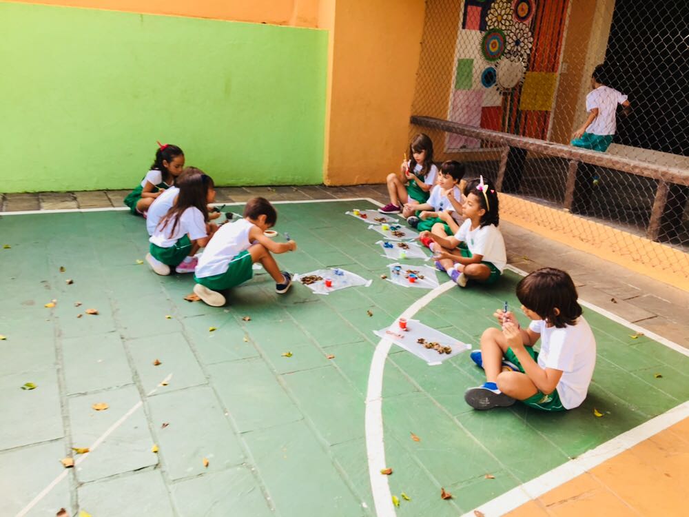 Explorando os elementos da natureza presentes nas florestas, tendo como integrante principal as árvores, o 1• ano iniciou a pintura de folhas caídas na estação do ano para a construção de um "móbile folharal". Exercitamos a motricidade fina e exploramos diversos suportes como as folhas do pátio.