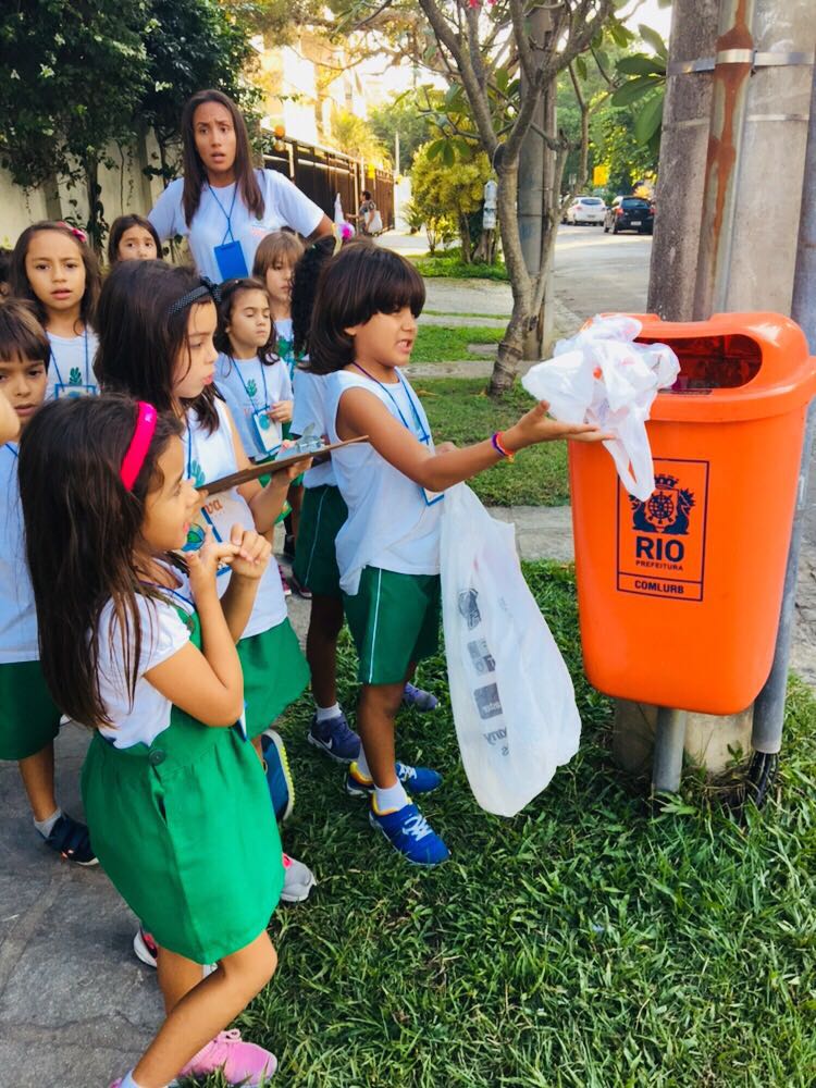 O 1º ano A observou a vista da janela da sala e percebeu a falta de elementos naturais, como as árvores. Fizemos então uma pesquisa de campo pela rua, com pranchetas para anotações e sacos plásticos para recolher objetos indesejáveis jogados pelo chão.