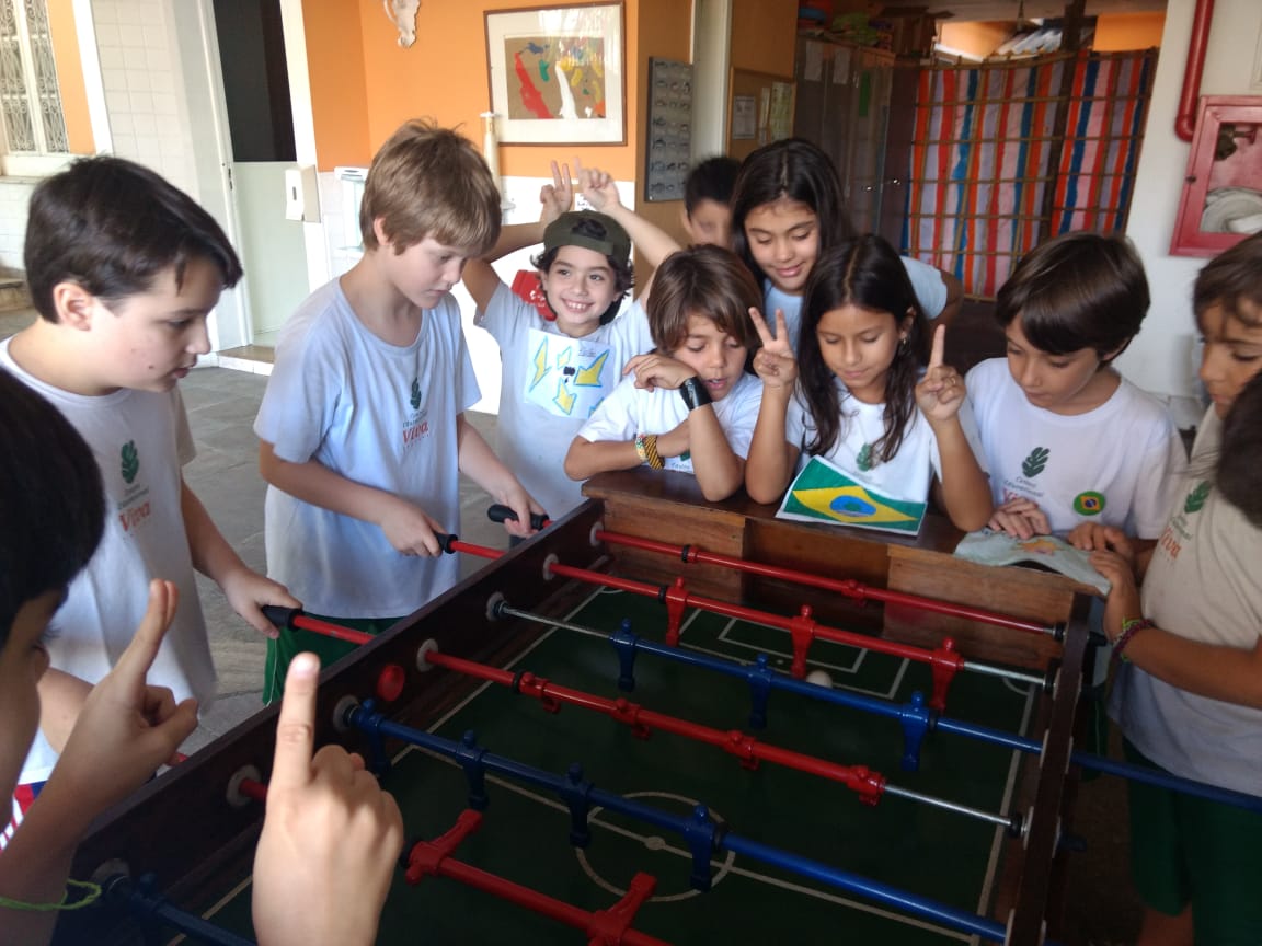 Aproveitando o clima da Copa do Mundo, os estudantes do 3º e 5º anos dividiram-se em duplas, montaram suas próprias bandeiras e participaram de uma competição de totó. Em Português, existem diversos nomes para designar este jogo: futebol de mesa, pebolim, totó... Em Inglês, não é diferente. Os americanos chamam o nosso futebol de mesa de "table soccer", já os ingleses não dizem "soccer" e sim "football" echamam de "table football". Outros nomes também utilizados são: "footzy", "foosball", "baby-foot" ou "kicker".