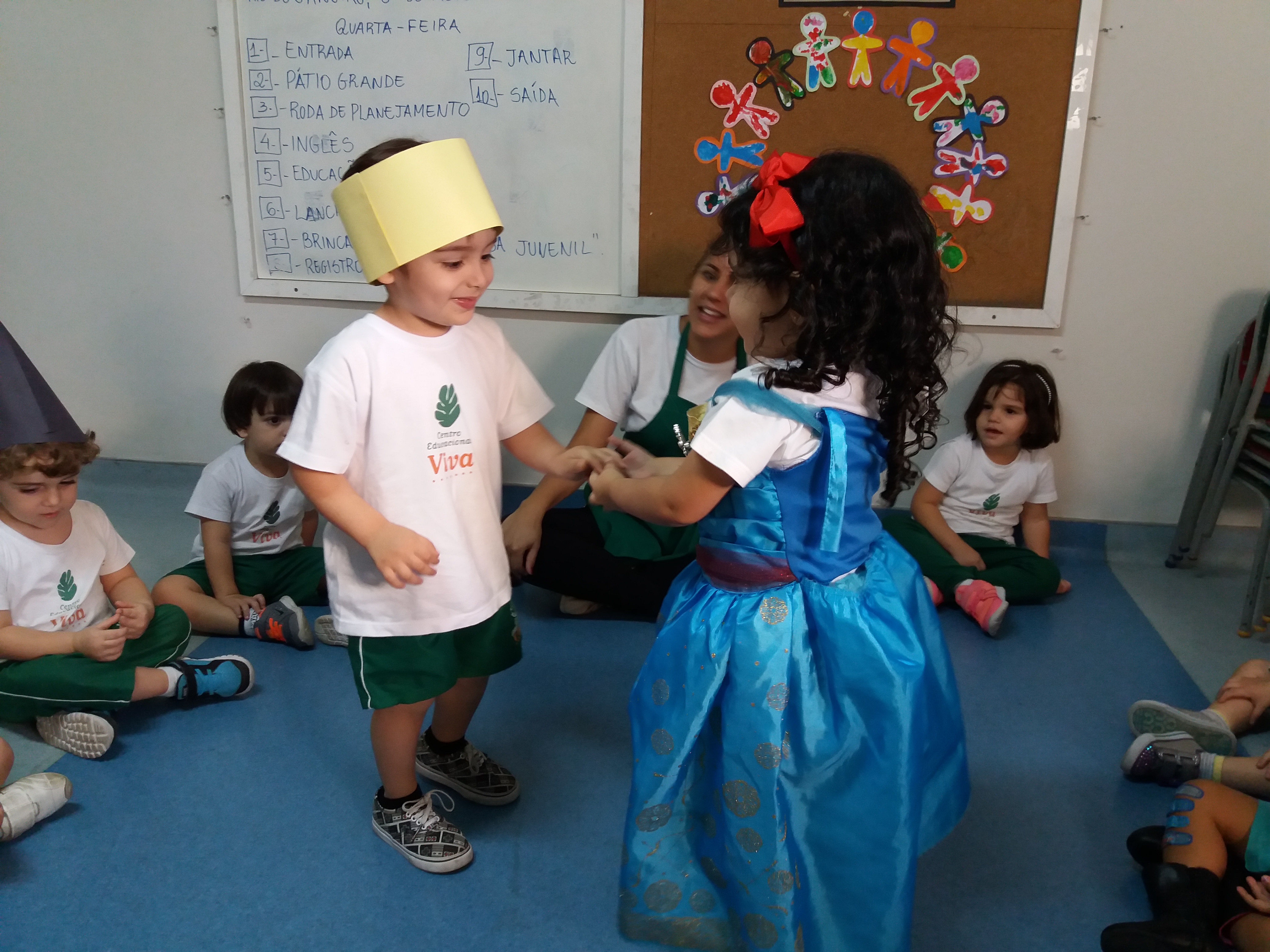 As crianças conheceram e cantaram a cantiga “A Linda Rosa Juvenil”, que conta a história de uma princesa que foi enfeitiçada por uma bruxa e adormeceu. Mas, depois de um tempo, o rei a despertou e eles viveram felizes para sempre. As crianças criaram o seu próprio figurino e dramatizaram a cantiga na sala e no pátio pequeno.