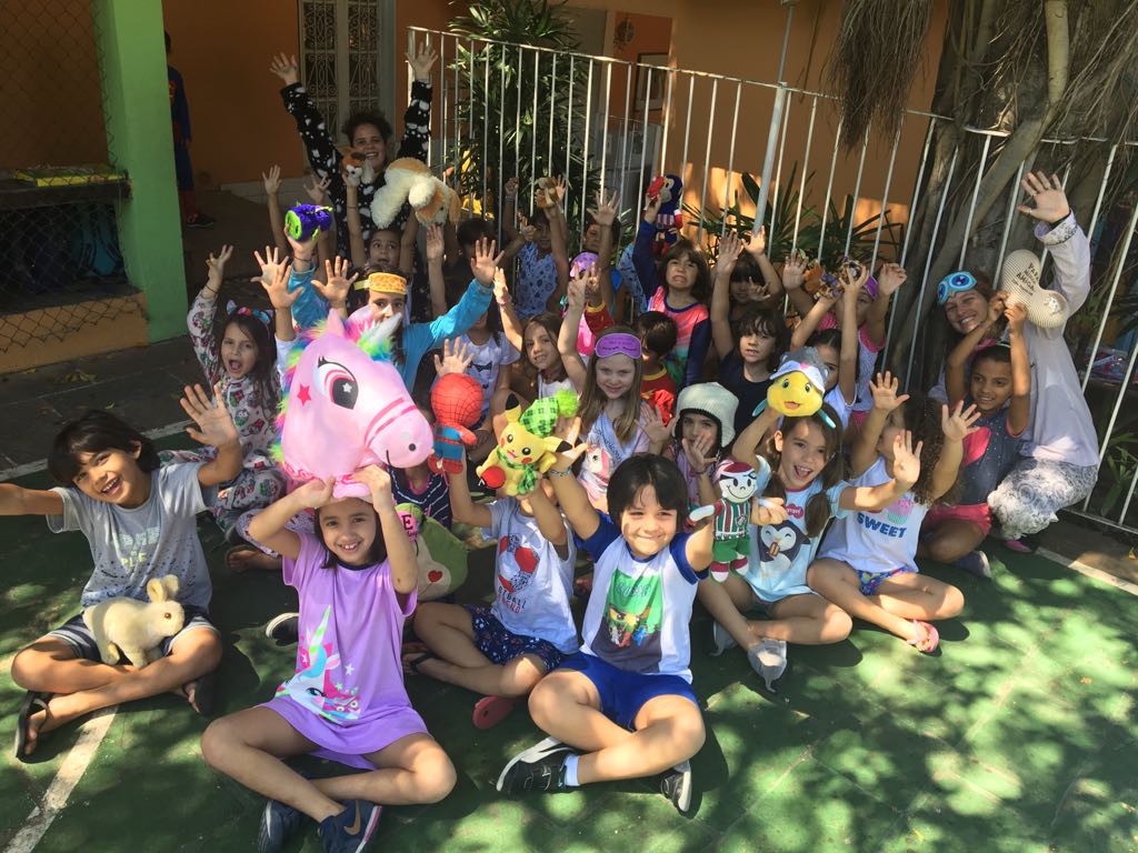 Na aula de inglês, o 1º ano A e B se juntaram numa Festa do Pijama e brincaram muito. Quem não gosta de desfile de moda e guerra de travesseiro? Foi um sucesso!
