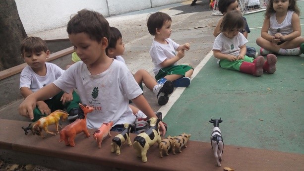 Durante uma vivência no areal, os nossos pequenos receberam garrafas vazias para brincarem. Durante as explorações das crianças, notamos que todas resolveram encher as garrafas com areia e, o tempo todo, usavam a linguagem matemática como: "eu vou encher a minha garrafa até ficar muito cheia", "a minha garrafa tem só um pouco de areia", "vou colocar mais um pouco de areia" e "a minha garrafa está ficando pesada". Após esta vivência, levamos as garrafas para a sala e demos continuidade às explorações das crianças, trabalhando conceitos matemáticos de cheio/vazio e leve/pesado. Em roda, solicitamos que eles organizassem as garrafas da mais cheia para a menos cheia. Nessa movimentação o grupo descobriu que quanto mais areia tiver a garrafa, mais pesada ela fica.