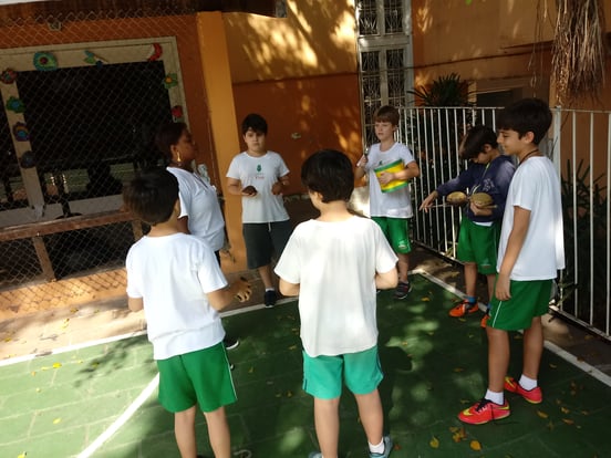 A Teacher Bárbara propôs ao grupo do 4º ano um jogo clássico: Cai Não Cai. O jogo foi utilizado como um recurso para avaliar a compreensão de um texto e estimular a oralidade da língua inglesa, dentro do contexto do livro didático adotado (Kid's Box...